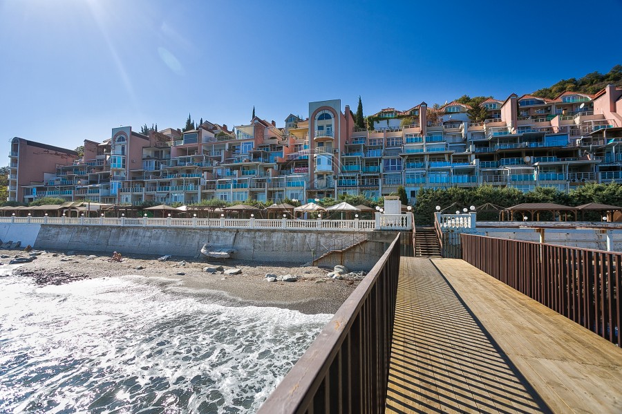 Сам комплекс апартаментов «Лазурный Элит» расположен на первой береговой линии в 8 км. от Алушты