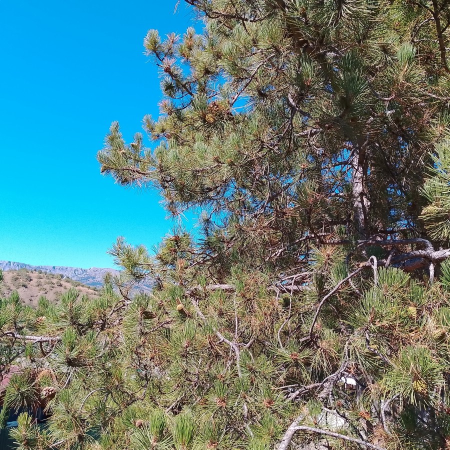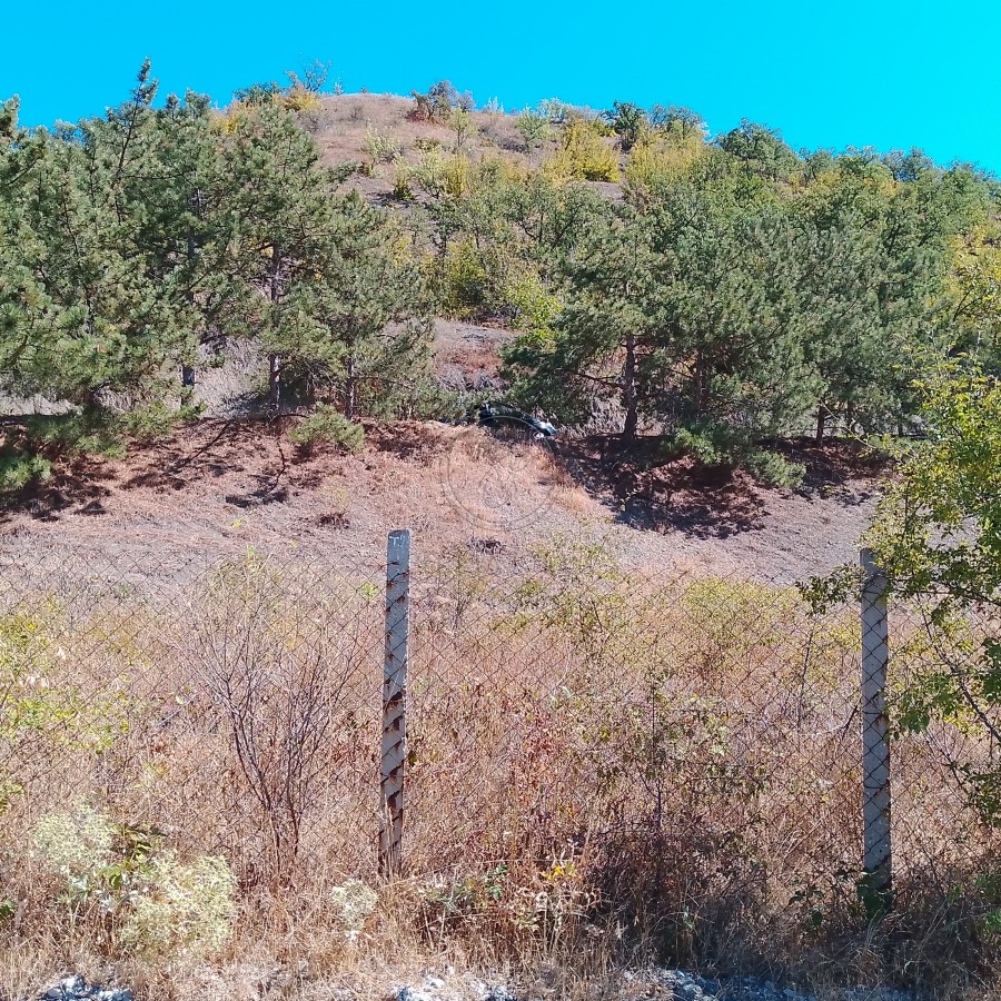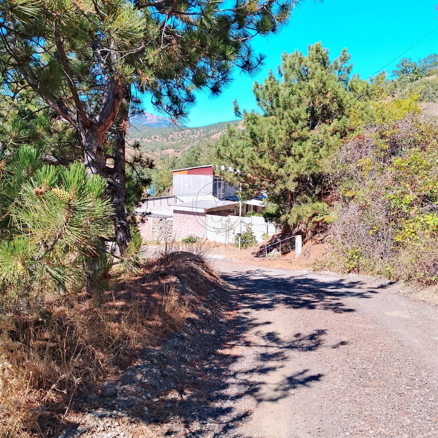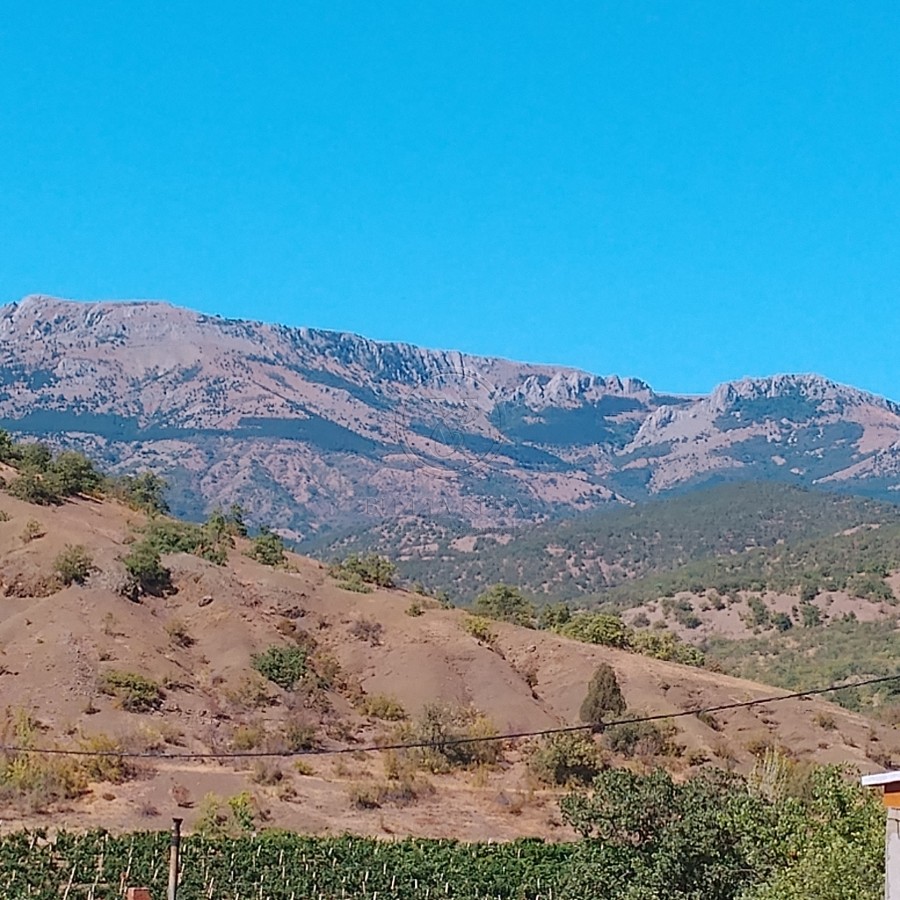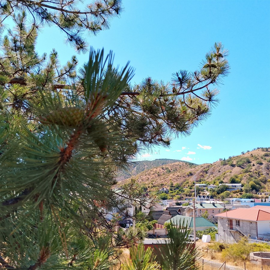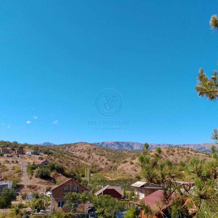 Вид на горы и виноградники,а также над участком растет линия сосен с шикарным воздухом.